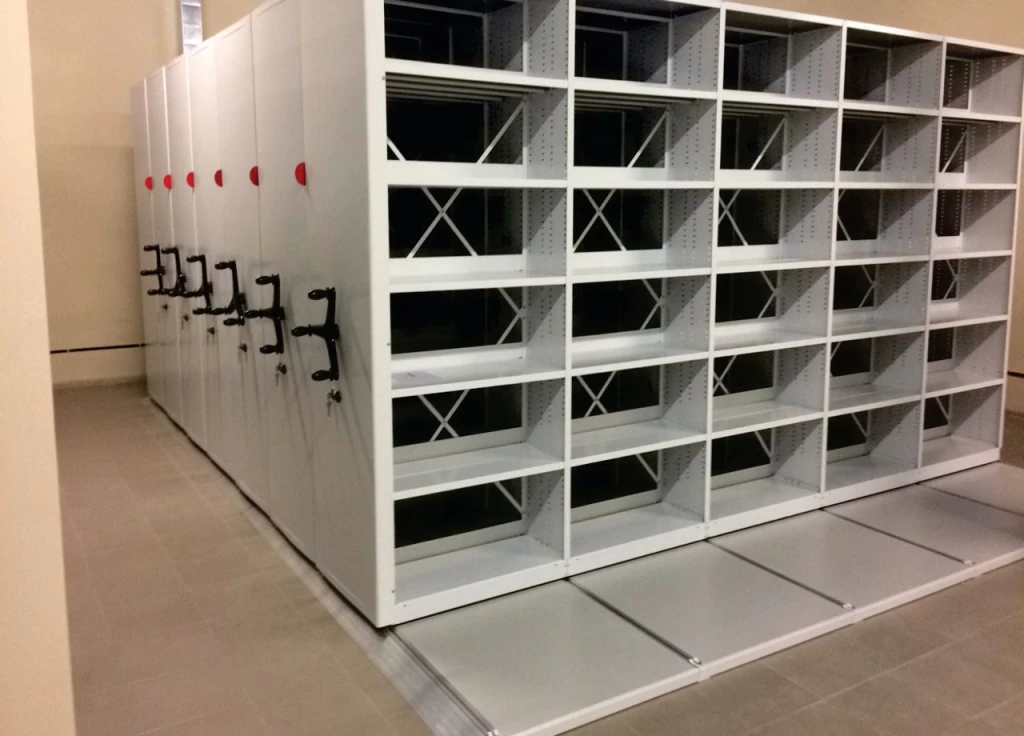 Архивные движущиеся стеллажи для помещений с высокими потолками и большой площадью. Эти механизированные стеллажи имеют усиленное основание из металла, которая увеличивает их несущую способность.