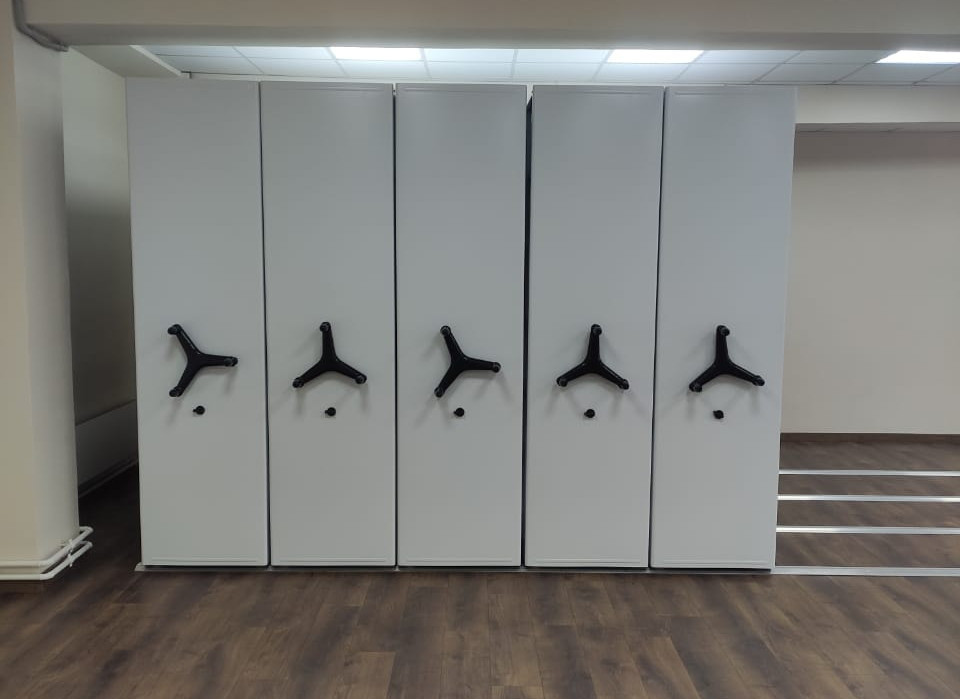 Основу конструкции мобильных стеллажей составляет разборное движущееся основание (база) с рельсовой системой, каркас, привод передвижения. Привод механический от штурвала, с автоматическим компенсатором ослабления натяжения цепи и стопорным механизмом. Трехлучевой пластиковый штурвал с вращающимися эргономичными рукоятками. Детали каркаса – сплошные стойки, полки, крестовины.