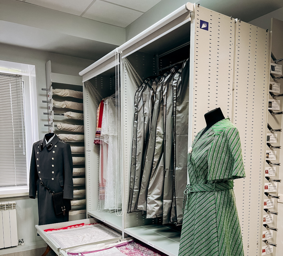 Стеллажи для хранения исторических костюмов в фондах музея