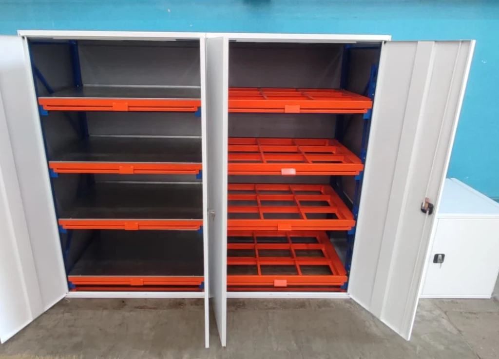 Выдвижные полки со съемными ящиками с разделителями для мелких деталей. Благодаря им каждая деталь, метиз или крепёж хранятся в своём отсеке. Это повышает точность, исключает потери и экономит время на поиск.