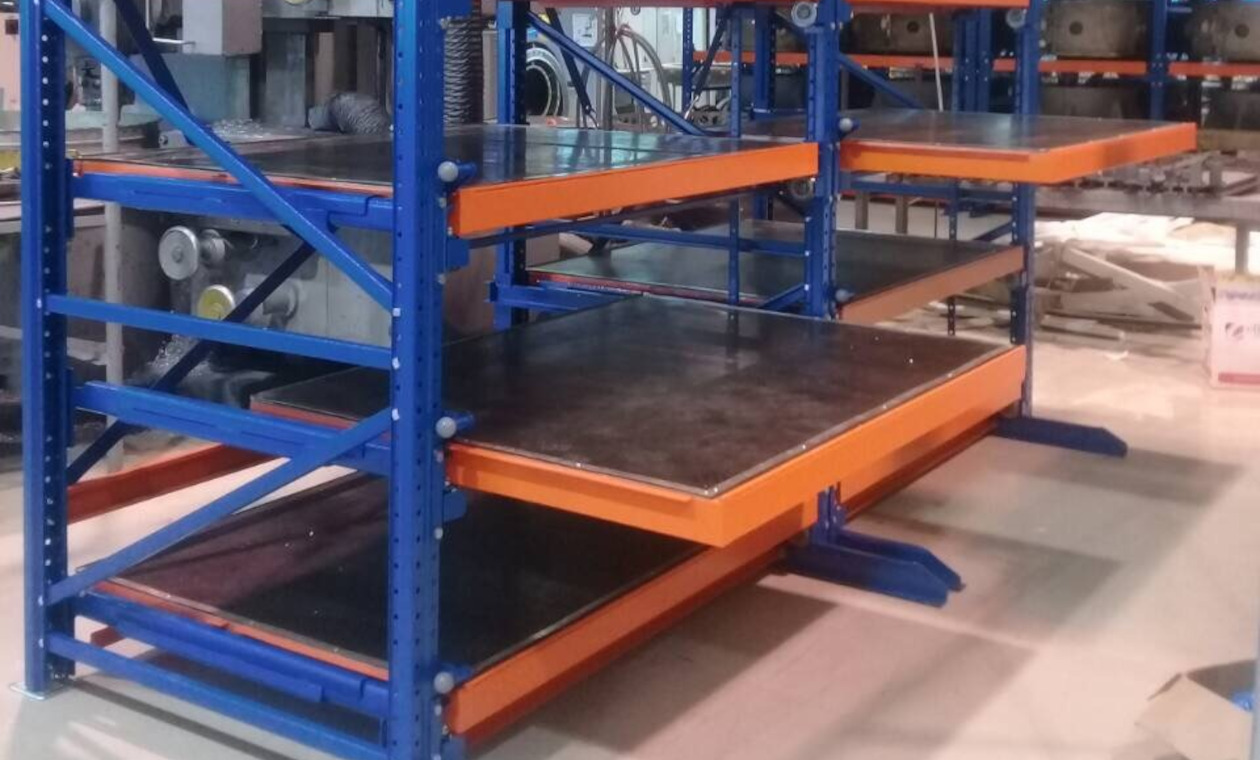 Металлические стеллажи серии Slide предназначены для хранения штамповой оснастки, сборочных узлов и прочих тяжелых грузов. Груз размещается на выкатных полках. Рабочая поверхность полок: оцинкованный металл. Для обеспечения большей сохранности и безопасности работы с грузом мы можем закрыть рабочую поверхность специальным покрытием. Чаще всего применяется тех пластина (коврик) ТМКЩ. Она амортизирует одиночные ударные воздействия, предотвращает трение металлических поверхностей друг о друга. Кроме стойкости на истирание, пластина фактически выполняет функцию коррозионной и химической защиты.